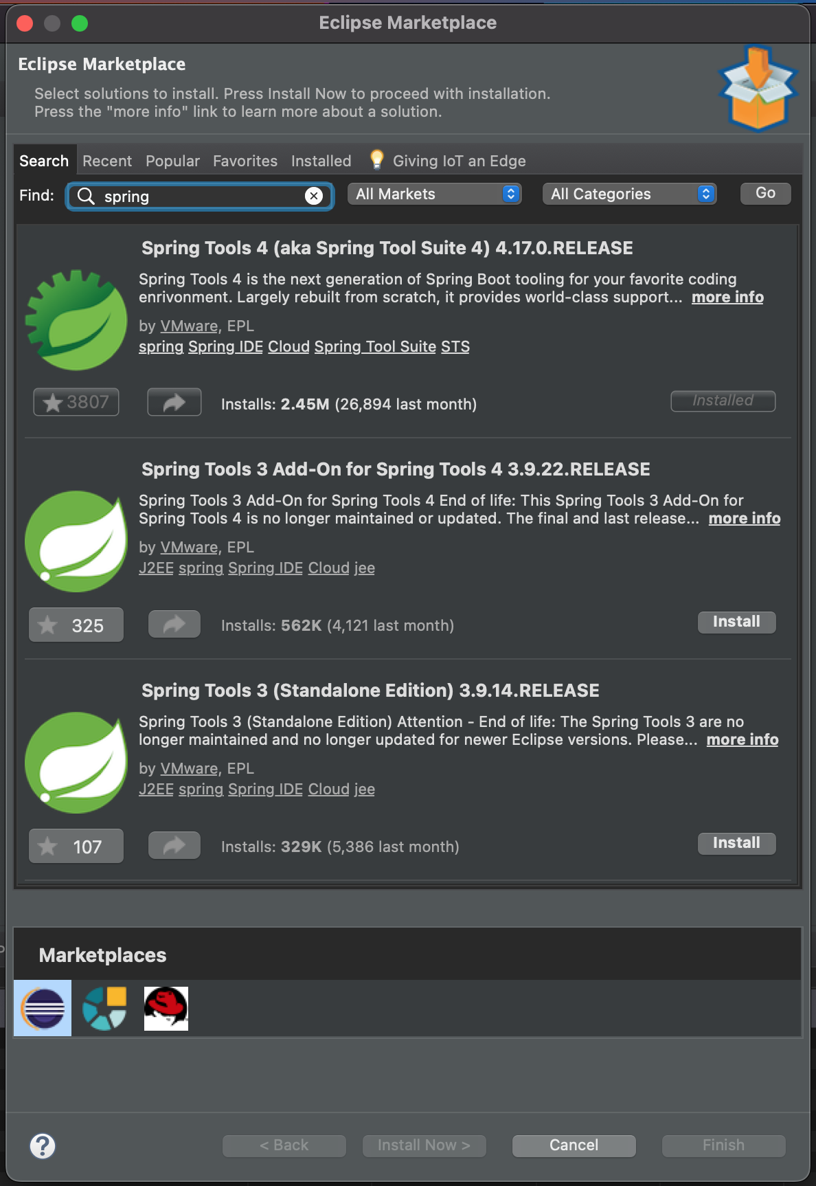 eclipse를 실행하면 Spring boot에 필요한 tools을 설치한다. 여기서 sts를 사용하는 환경은 생략해도 된다.