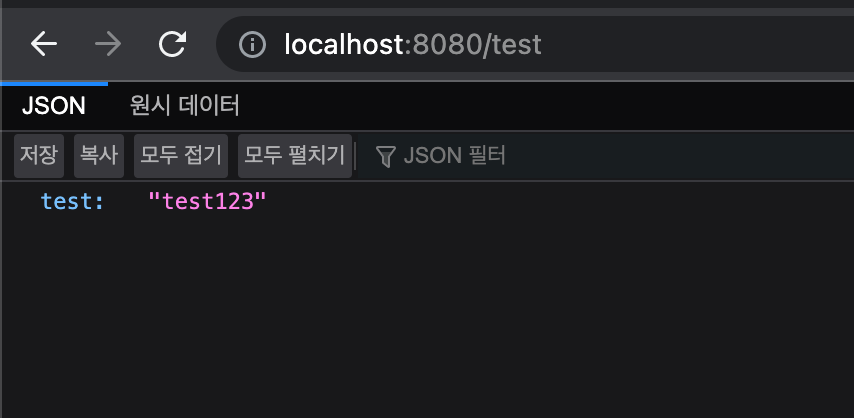 Rest Controller로 만들었기 때문에 ui 화면은 없고 결과로 반환했던 json 구조의 데이터만 볼 수 있다.