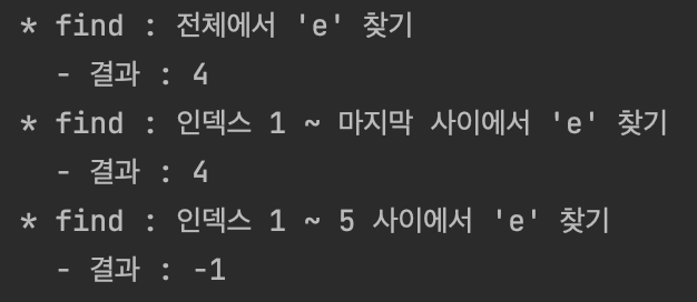 - 인자값 3 : find와 동일, 찾으려는 대상 문자열에서 끝나는 인덱스 번호 지정