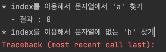 print('* index를 이용해서 문자열에 없는 \'h\' 찾기')