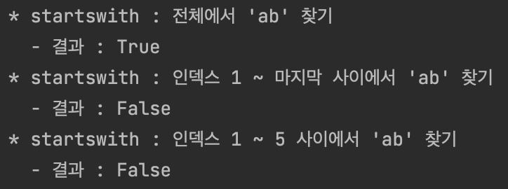 print('* startswith : 인덱스 1 ~ 마지막 사이에서 \'ab\' 찾기')