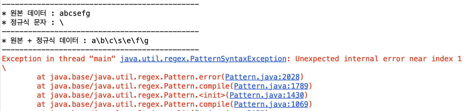 에러 내용 마지막에 보게 되면 '\' 구문이 나와 있다. 그리고 에러를 발생한 exception은 친절하게 regex.Pattern.error에서 발생이 났나고 알려준다. '\' 문자는 예약된 정규식 문자라서 일반 문자와 함께 쓸 때는 '\\' 두 개를 붙여서 써줘야 하며, 위의 에러를 발생시켜 해결을 해보도록 하자.