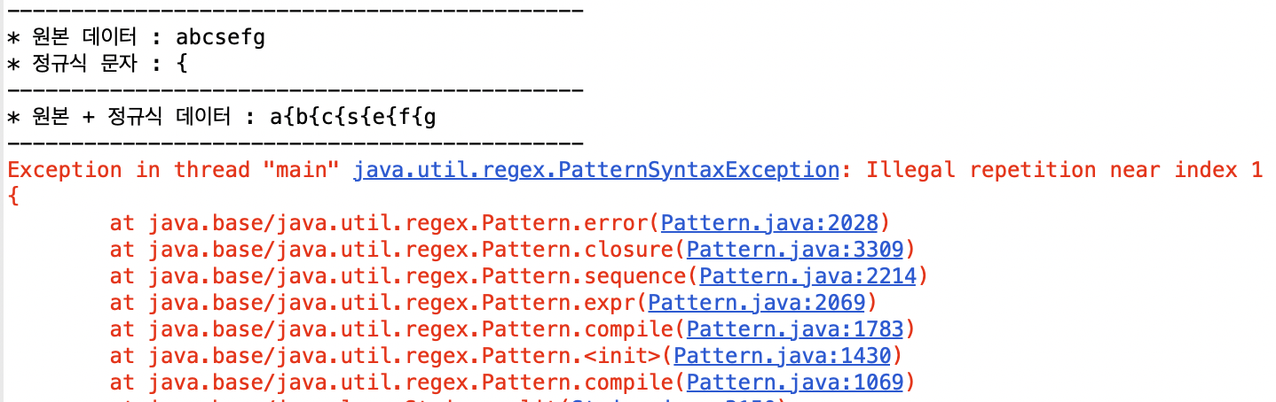 실행 결과는 역시 "{" 정규식 문자 기준으로 split을 실행하면 동일한 에러가 발생을 한다.
