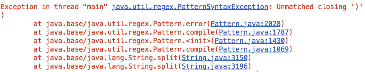")" 정규식 문자로 사용할 때에는 앞에 "(" 문자를 같이 사용해 줘야 합니다. 하지만 앞에 "("를 사용하지 않고 정규식을 일반 문자로 처리하지 않았기 때문에 위와 같은 에러가 발생을 했습니다. 그럼 "(" 문자를 일반 문자로 split 될 수 있도록 처리해 보겠습니다.