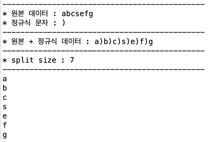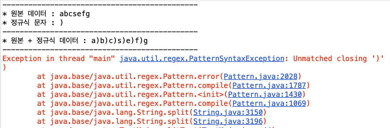 실행 결과는 위와 같이 에러가 발생하였습니다. split에 ")"만 넣고 실행을 하게 되면 ")"는 정규식 예약 문자이기 때문에 split에서 인식할 때에는 일반 문자가 아닌 정규식 문자로 처리가 되게 됩니다.